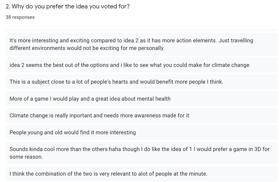 Below are the results from survey I conducted for my primary research, I asked several questions relating to my project, and then used this to help me come to a decision of what I wanted my project to be about. In the end, more people seemed drawn to my first idea which is a 2D side-scroller based around mental health. So this is the idea I decided to go with.